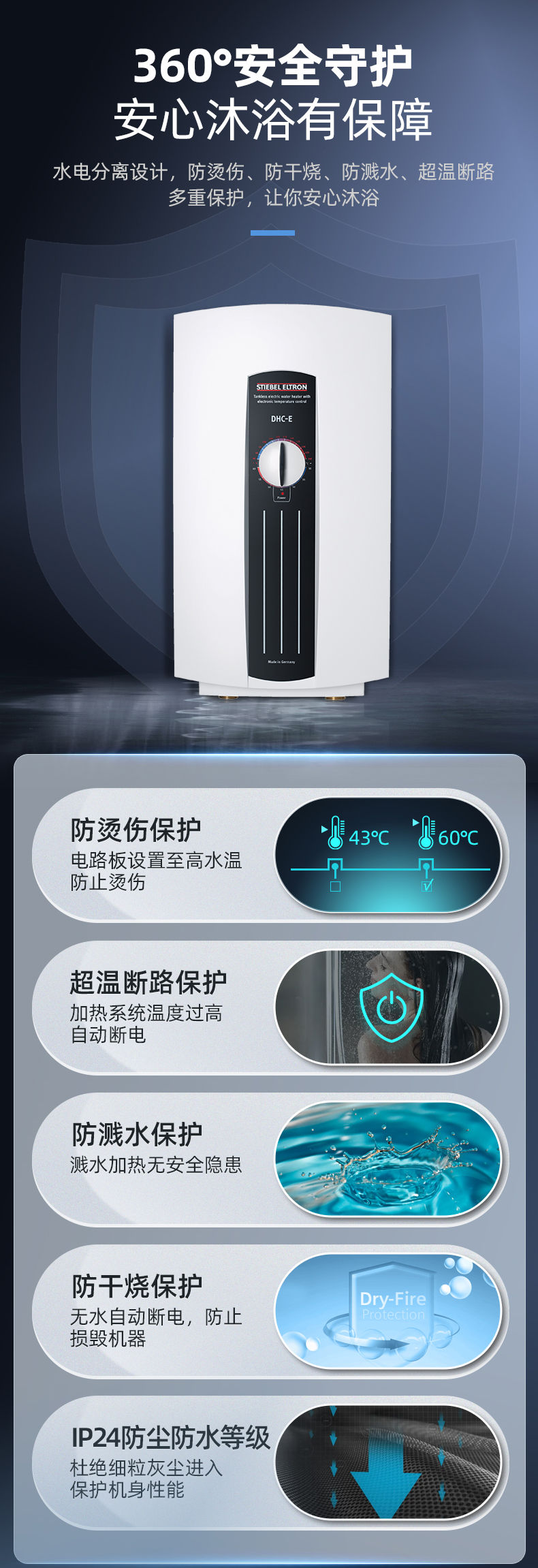 产品特点:中央多路供水微电脑控制,无极功率调节精确控温,30-60℃之间任意选择,不会忽冷忽热超低启动流量(1.4L/min)低水压也适用“防烫伤”保护功能,太阳能联合工作模式“超级紫铜”发热系统,发热效率达99%IP24全方位机身防尘、防溅水保护、双重超温断路保护(60℃、85℃)AIG Eruope欧洲保险公司承保2500万欧元的产品责任险